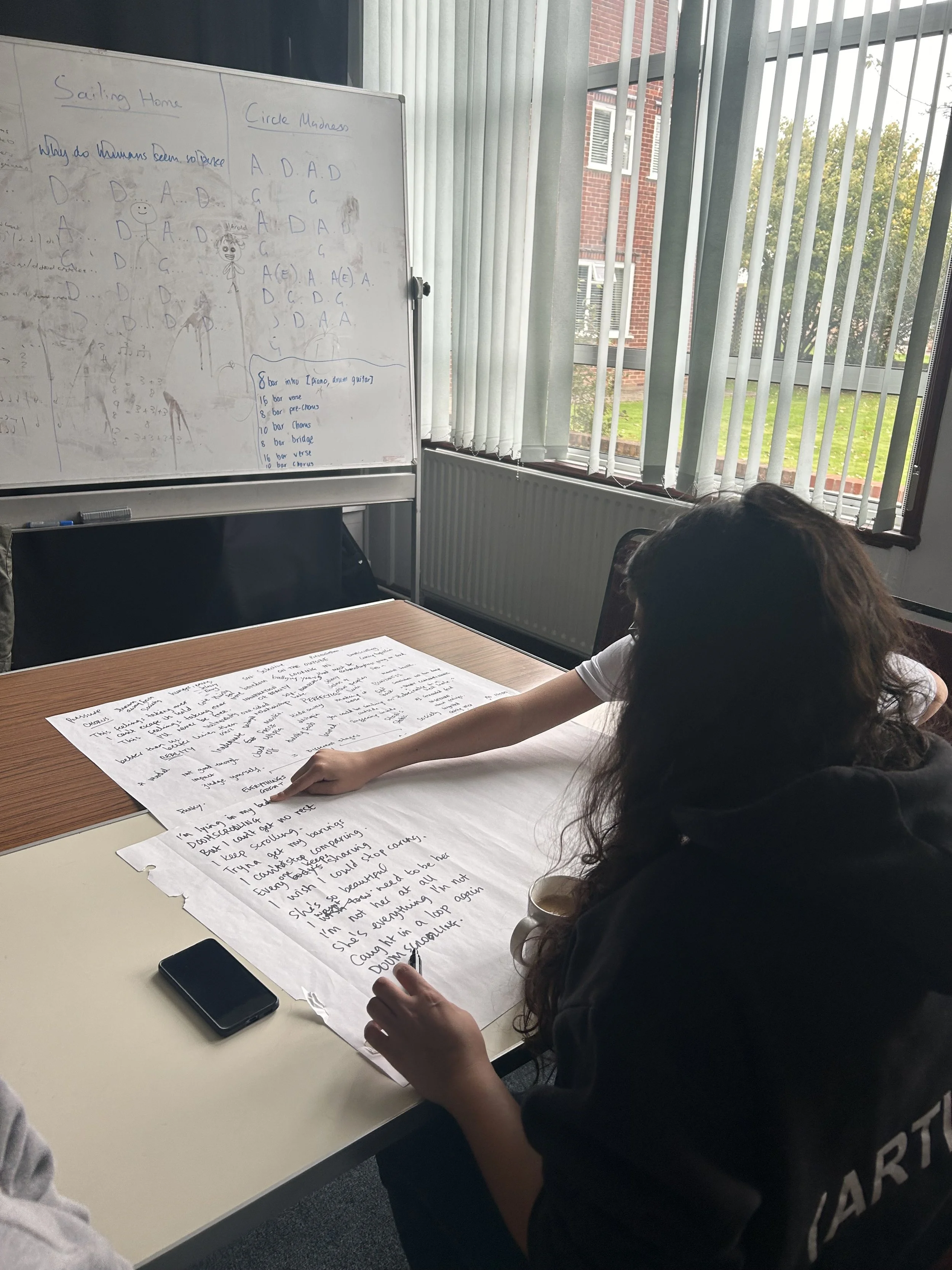 From the first taster sessions, the group began to respond to the ideas of AI and the insecurities that come from growing up in a digital world. We began workshopping lyrics dealing with exposure to social media and the pressures of hype, clout and popularity. Since our first sessions, these lyrics have continued to be developed, and we’re excited to share them on Sunday.